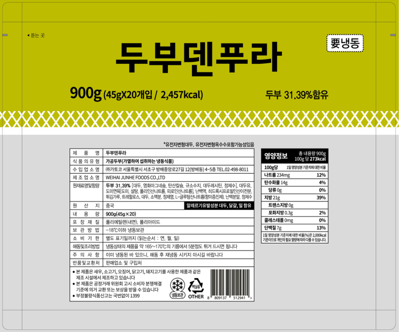 제품명 : 두부덴푸라 원산지 : 중국 규격 : 900g(45g*20EA) 성분 : 두부 31.39%, 도미연육 14.66% 보관방법 : -18℃ 이하 냉동보관 소비기한 : 제조일로부터 24개월까지 조리방법 : 냉동 상태의 제품을 약 175℃ 기름에서 4분간 튀겨 드세요.