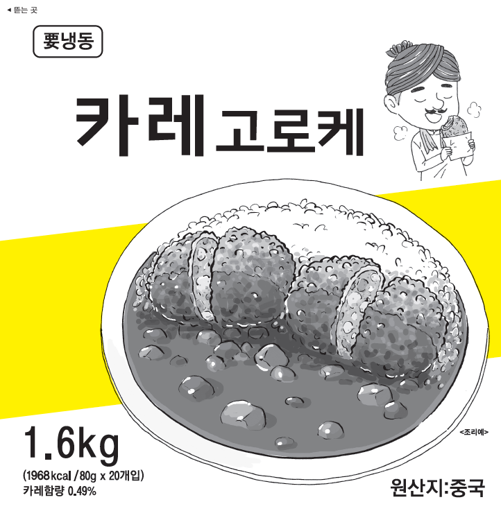 제품명 : 카레고로케 1.6kg 규격 : 1.6kg(80g*20EA) 성분 : 감자 59.59%, 카레 0.49%, 당근, 양파 보관방법 : -18℃ 이하 냉동보관 소비기한 : 제조일로부터 24개월까지 조리방법 : 냉동 상태의 제품을 약 175℃의 기름에서 2~3분간 튀겨 드세요.