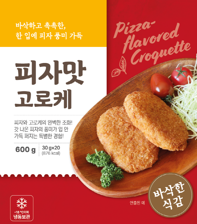 제품명 : 피자맛 고로케 원산지 : 중국 규격 : 600g (30G*20) 성분 : 감자, 빵가루, 양파, 옥수수, 토마토파스타소스 등 보관방법 : -18℃ 이하 냉동보관 소비기한 : 별도 표시일까지 (읽는순서 : 연,월,일) 조리방법 ① 냉동상태의 제품을 약 165~ 175℃ 로 예열해 주세요. ② 예열이 완료되면 냉동상태의 제품을 넣고 3~5분간 튀겨 드세요.