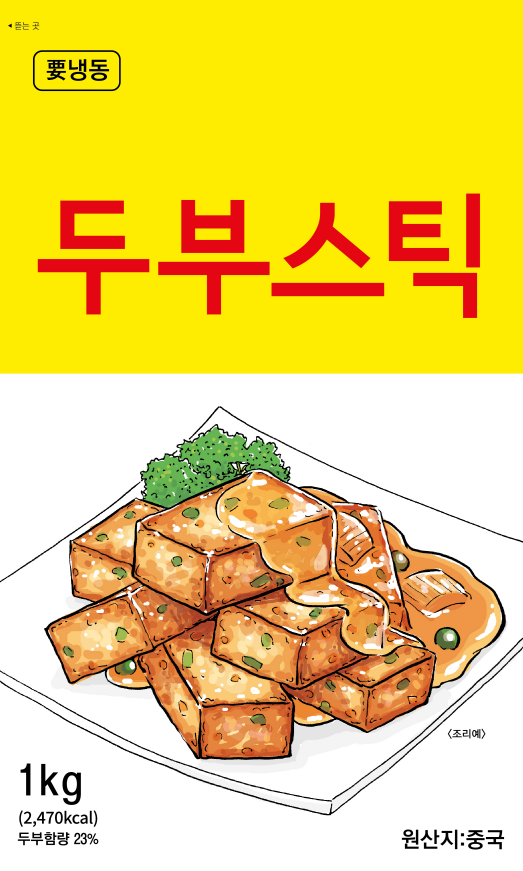 제품명 : 두부스틱 원산지 : 중국 규격 : 1kg(100±10EA) 성분 : 두부 23%, 양파 보관방법 : -18℃ 이하 냉동보관 소비기한 : 제조일로부터 24개월까지 조리방법 : 냉동 상태의 제품을 약 170 ~175℃의 기름에서 약 2~3분 간 튀겨 드세요.