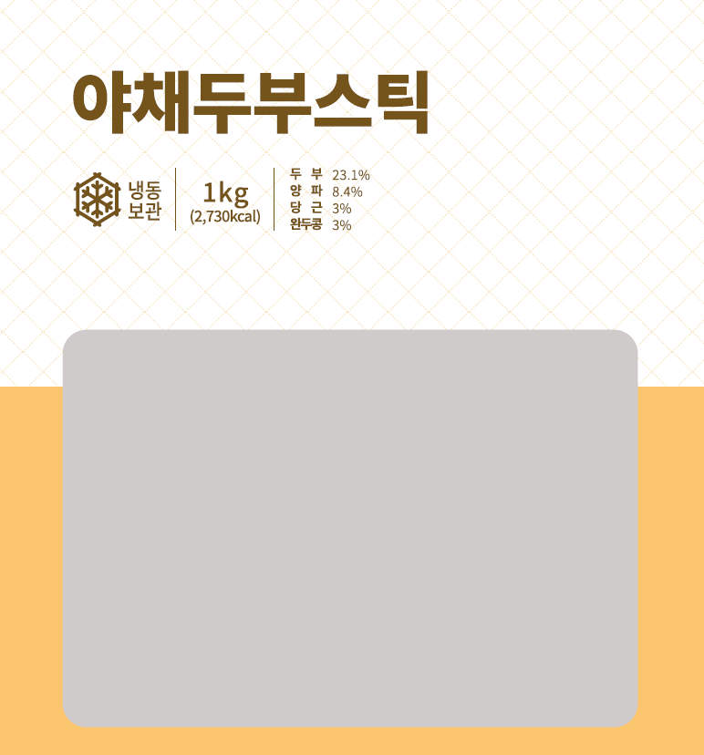 제품명 : 야채두부스틱 원산지 : 중국 규격 : 1kg(90~100EA) 성분 : 두부 23.1%, 양파 8.4%, 당근 3%, 완두 3% 보관방법 : -18℃ 이하 냉동보관 소비기한 : 제조일로부터 24개월까지 조리방법 : 냉동 상태의 제품을 약 170 ~175℃의 기름에서 약 2~3분 간 튀겨 드시면 됩니다.