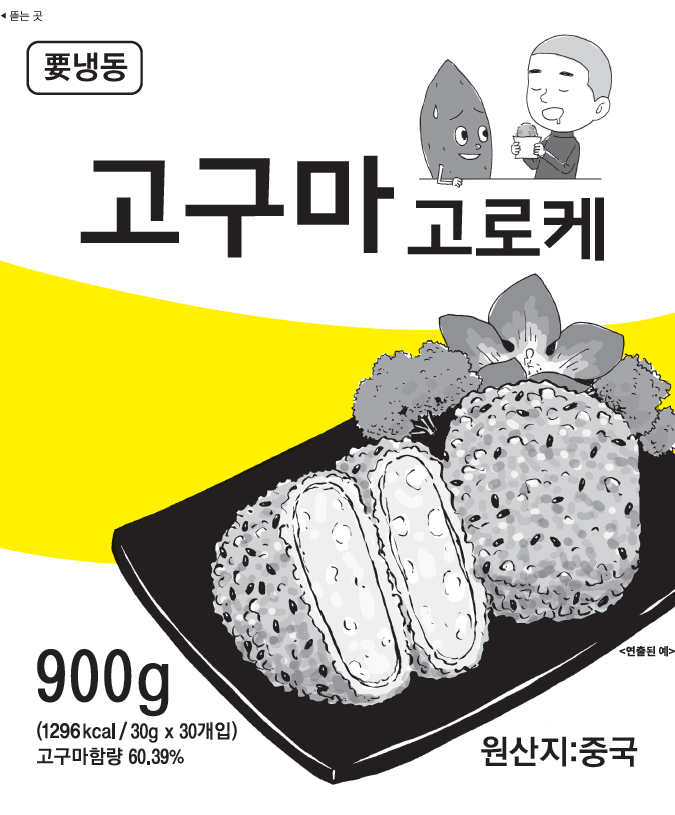 제품명 : 고구마고로케 원산지 : 중국 규격 : 900g(30g*30EA) 성분 : 고구마 60.39% 보관방법 : -18℃ 이하 냉동보관 소비기한 : 제조일로부터 24개월까지 조리방법 : 냉동 상태의 제품을 약 175℃의 기름에서 2~3분간 튀겨 드세요.