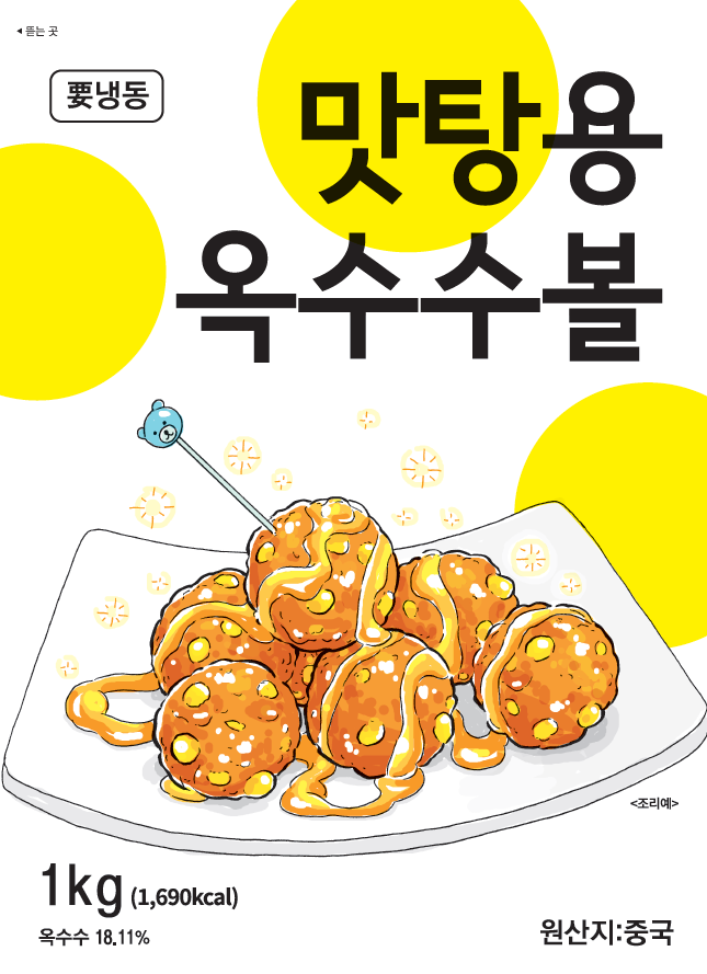 제품명 : 맛탕용 옥수수볼 원산지 : 중국 규격 : 1kg(20g*50EA) 성분 : 옥수수 18.11%, 옥수수파우더 11.05% 보관방법 : -18℃ 이하 냉동보관 소비기한 : 제조일로부터 24개월까지 조리방법 : 냉동 상태의 제품을 160~170℃의 기름에서 2~3분간 튀겨 드세요.