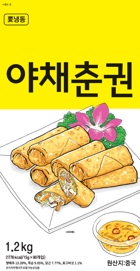 제품명 : 야채춘권 원산지 : 중국 규격 : 1.2kg(15g*80EA) 성분 : 양배추 13.39%, 죽순 9.05%, 당근 7.77% 보관방법 : -18℃ 이하 냉동보관 소비기한 : 제조일로부터 24개월까지 조리방법 : 냉동 상태의 제품을 약 170~175℃ 기름에서 3~4분간 튀겨 드세요.