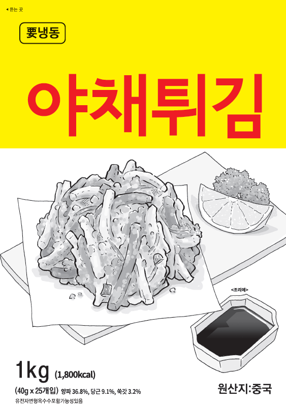 제품명 : 야채튀김 원산지 : 중국 규격 : 1kg(40g*25EA) 성분 : 양파 36.8%, 당근 9.1%, 고구마 9.1%, 쑥갓 3.2% 보관방법 : -18℃ 이하 냉동보관 소비기한 : 제조일로부터 24개월까지 조리방법 : 냉동 상태의 제품을 약 170~175℃ 기름에서 3~4분간 튀겨 드세요.
