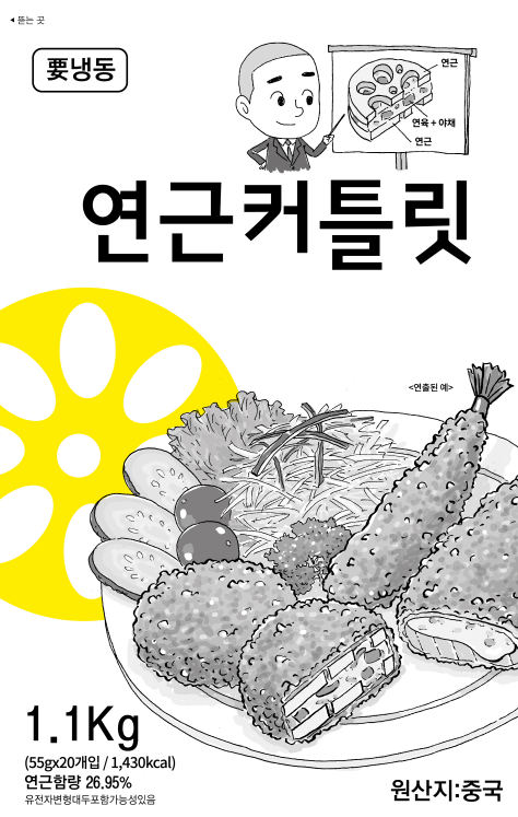 제품명 : 연근커틀릿 원산지 : 중국 규격 : 1.1kg(55gX20ea) 성분 : 연근 26.95%, 빵가루, 오징어, 양파 보관방법 : -18℃ 이하 냉동보관 소비기한 : 제조일로부터 24개월까지 조리방법 :냉동 상태의 제품을 약 165~170℃ 기름에서 8분~8분30초간 튀겨 드세요.