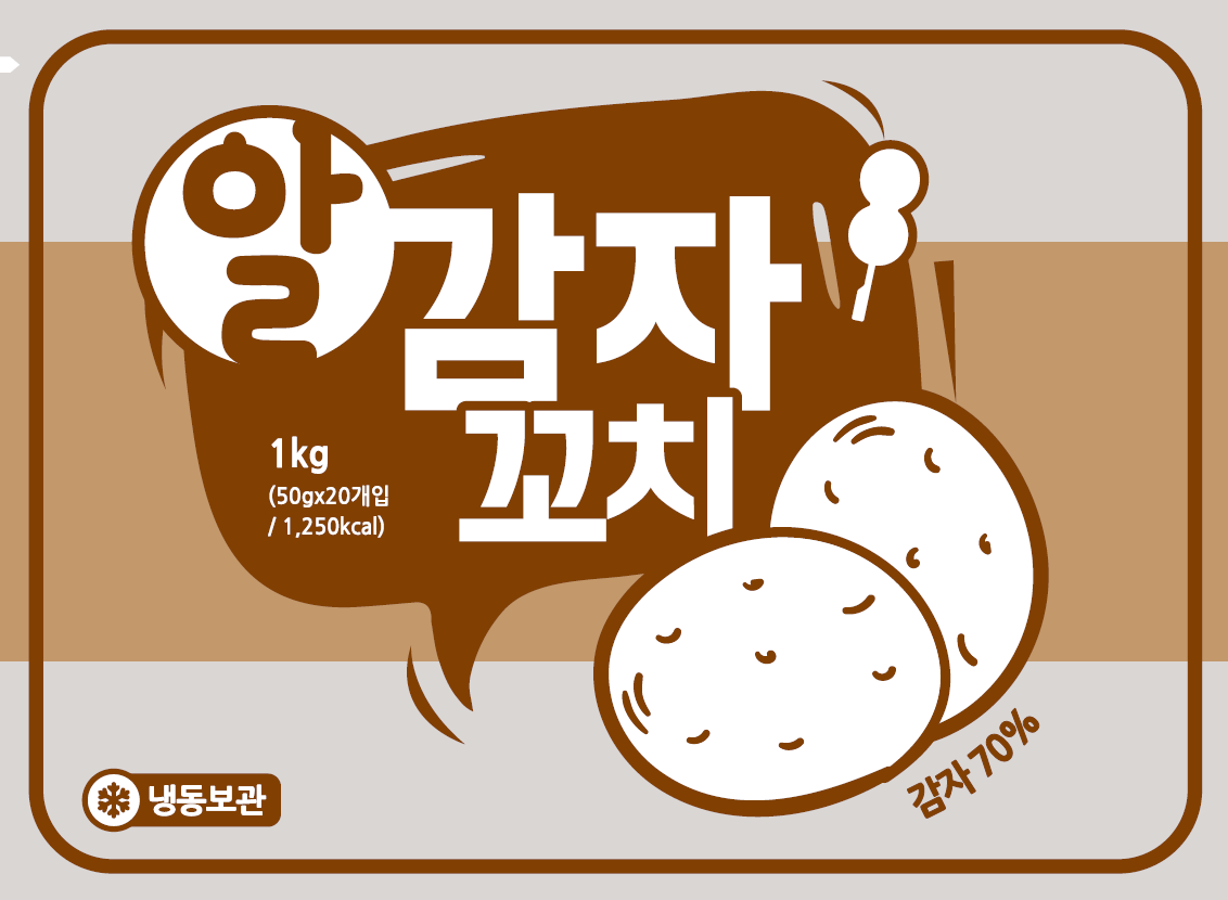 제품명 : 알감자꼬치 원산지 : 중국 규격 : 1kg(50g*20EA) 성분 : 감자 70%, 빵가루, 배터믹스, 쌀파우더 보관방법 : -18℃ 이하 냉동보관 소비기한 : 제조일로부터 24개월까지 조리방법 : 냉동상태의 제품을 약170~175도 기름에서 약 5분간 튀겨 드세요.