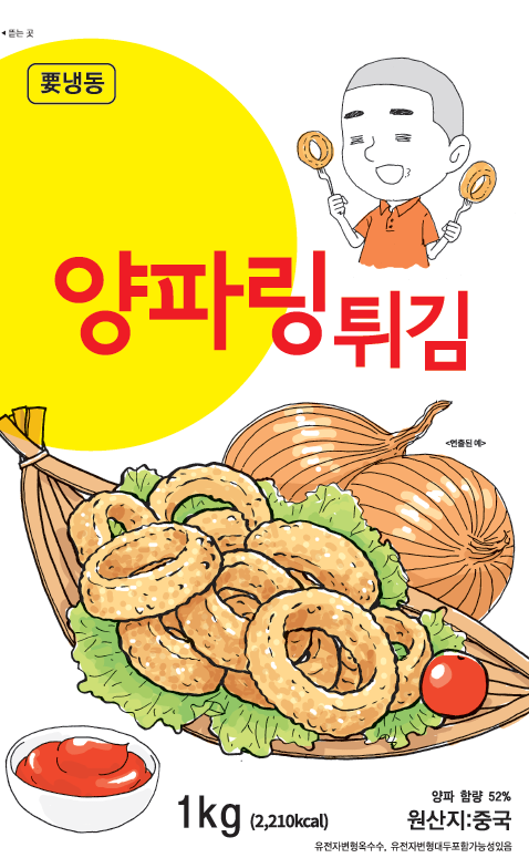 제품명 : 양파링튀김 원산지 : 중국 규격 : 1kg(60EA±5) 성분 : 양파 52%, 배터믹스, 옥수수전분 보관방법 : -18℃ 이하 냉동보관 소비기한 : 제조일로부터 24개월까지 조리방법 : 냉동 상태의 제품을 180℃의 기름에서 2~3분간 튀겨 드세요.
