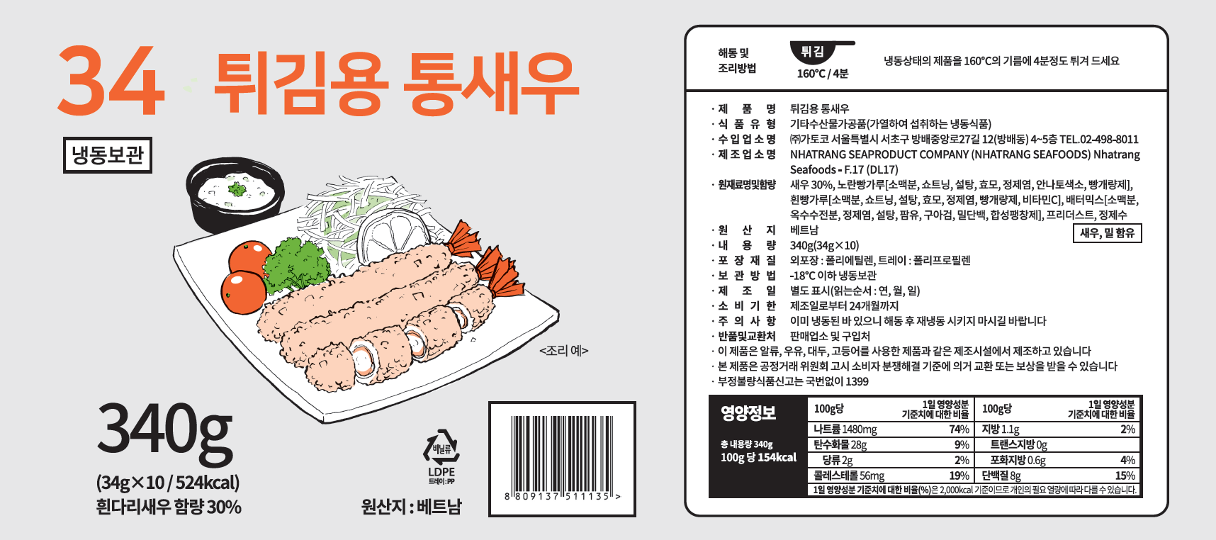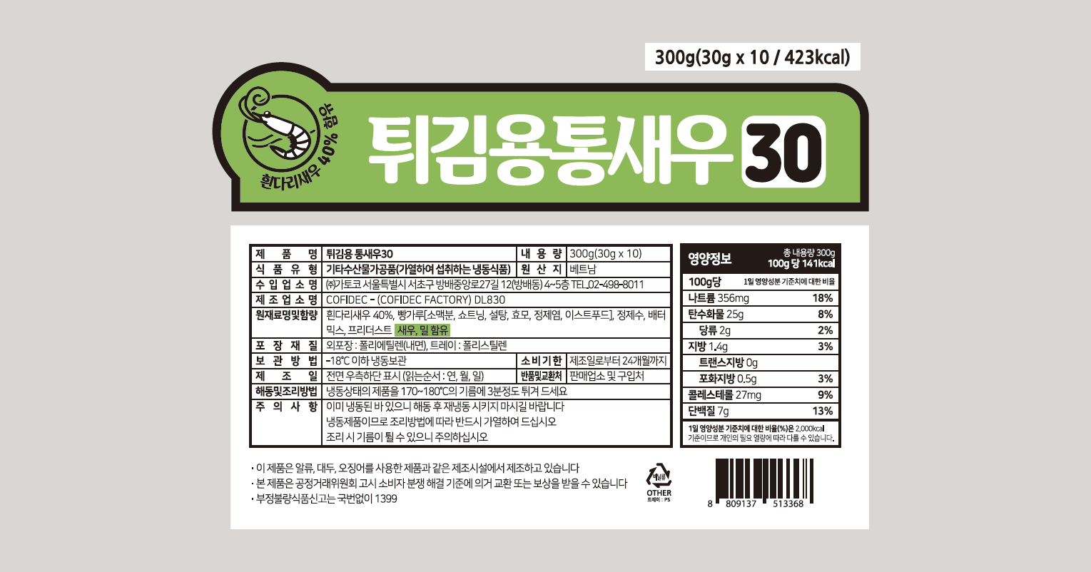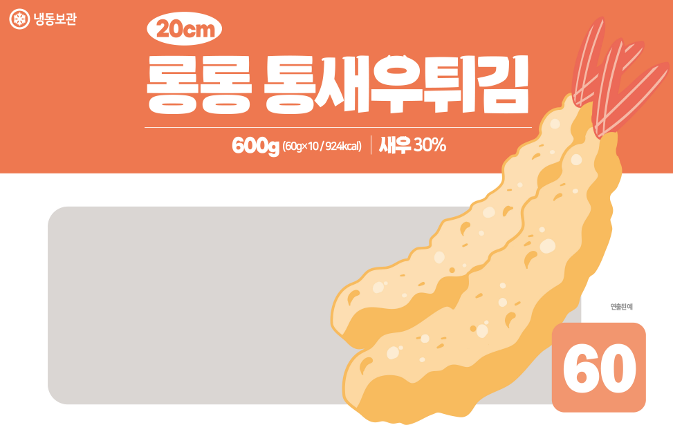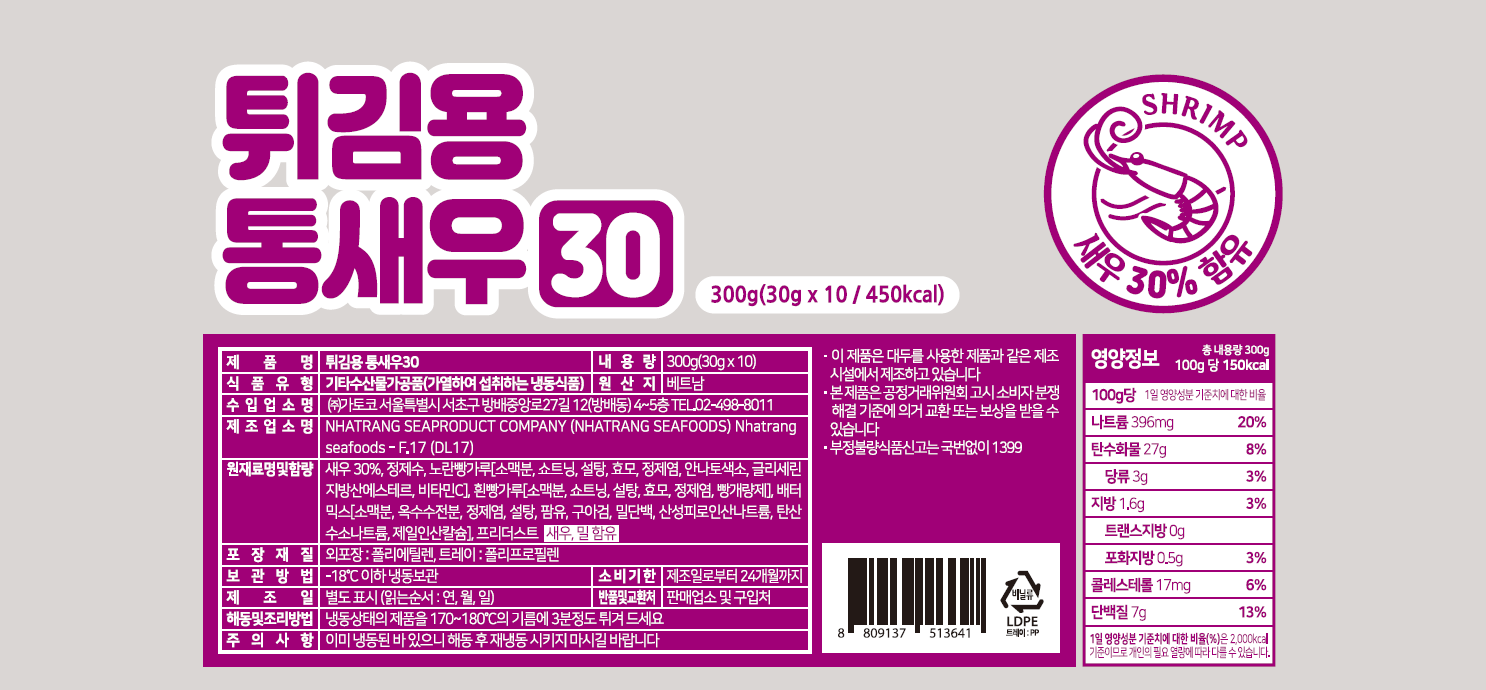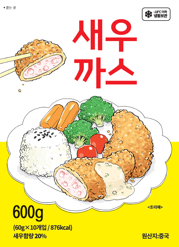 성분 : 얼룩새우 50%, 노란빵가루[소맥분, 쇼트닝, 효모, 정제염, 안나토색소, 설탕, 빵개량제], 흰빵가루[소맥분, 쇼트닝, 효모, 정제염, 설탕, 빵개량제], 정제수, 프리더스트[인산이전분,