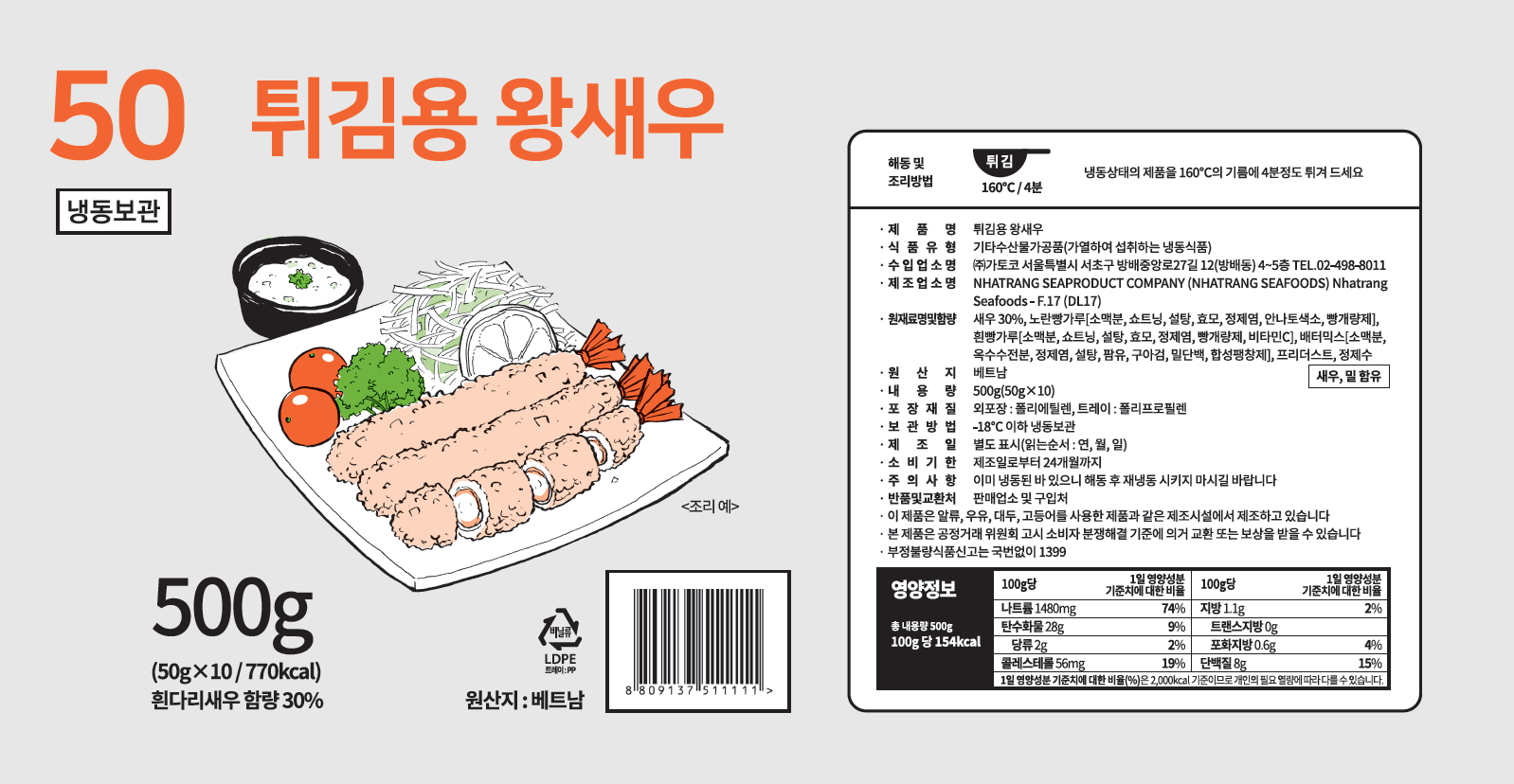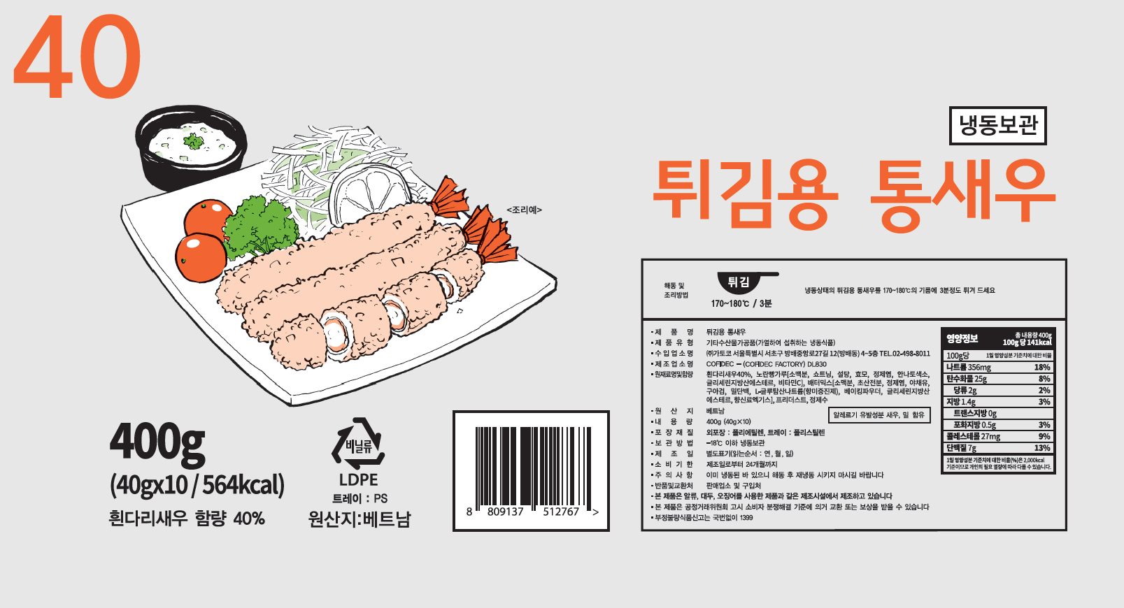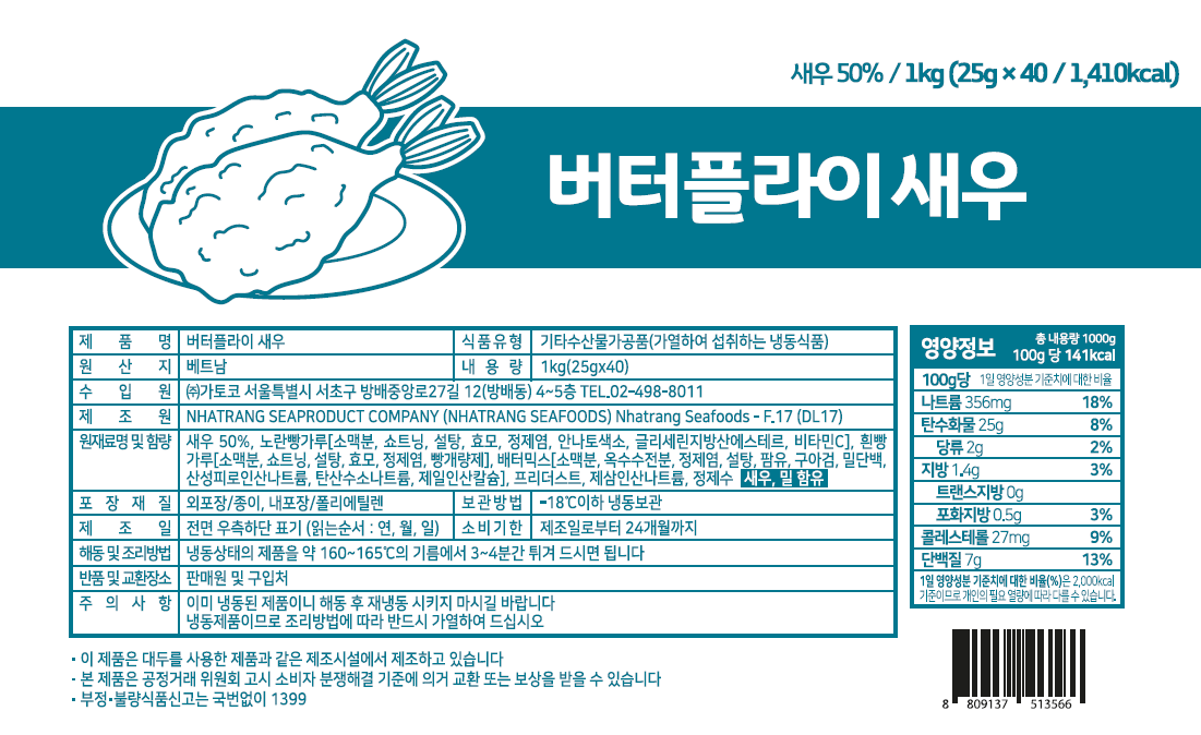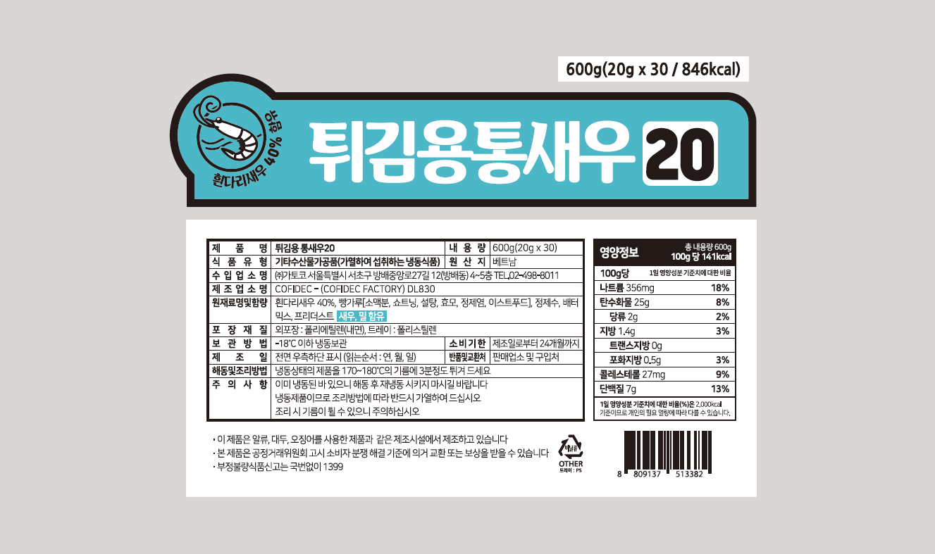 성분 : 얼룩새우 50%, 노란빵가루[소맥분, 쇼트닝, 효모, 정제염, 안나토색소, 설탕, 빵개량제], 흰빵가루[소맥분, 쇼트닝, 효모, 정제염, 설탕, 빵개량제], 정제수, 프리더스트[인산이전분,