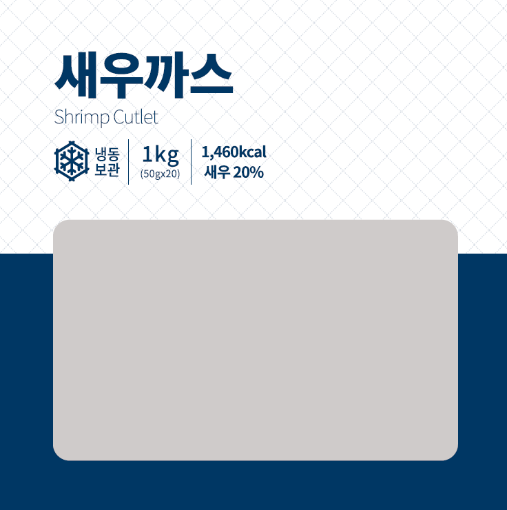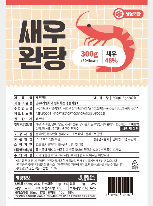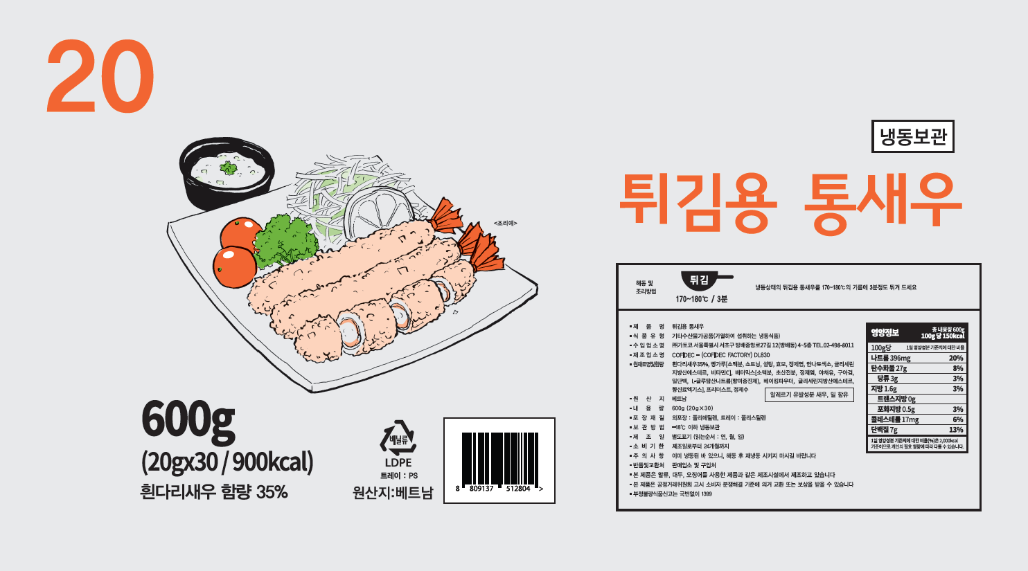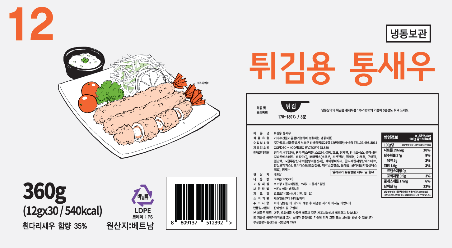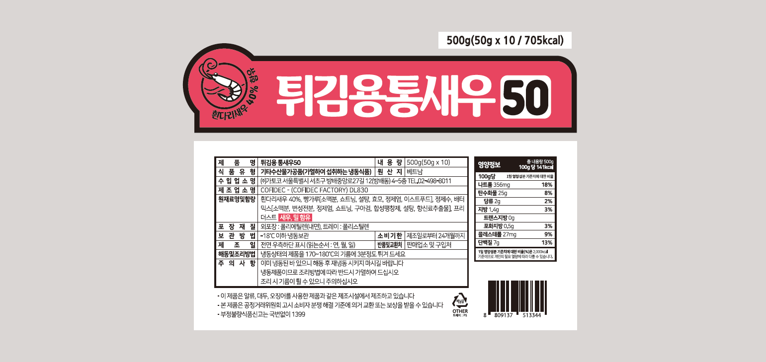 성분 : 얼룩새우 50%, 노란빵가루[소맥분, 쇼트닝, 효모, 정제염, 안나토색소, 설탕, 빵개량제], 흰빵가루[소맥분, 쇼트닝, 효모, 정제염, 설탕, 빵개량제], 정제수, 프리더스트[인산이전분,